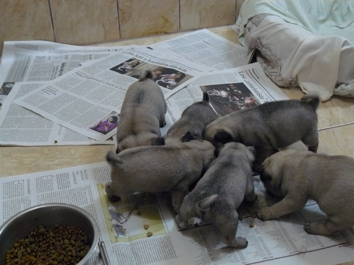 - When you receive your new Pug puppy, he/she will be accustomed to eating 3 times a day (morning, noon, and evening). Because we feed more than one puppy at the same time (the rest of their litter mates), we put a large bowl full of their puppy food in their kennel and let them eat until they are satisfied. Once all of them walk away from the bowl we know they are done, and we take it away.